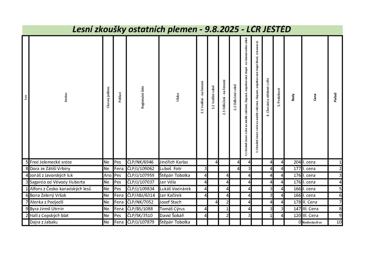 Výsledky a průběh zkoušek - Barvářské zkoušky honičů - 6.9.2025 - Petrašovice
