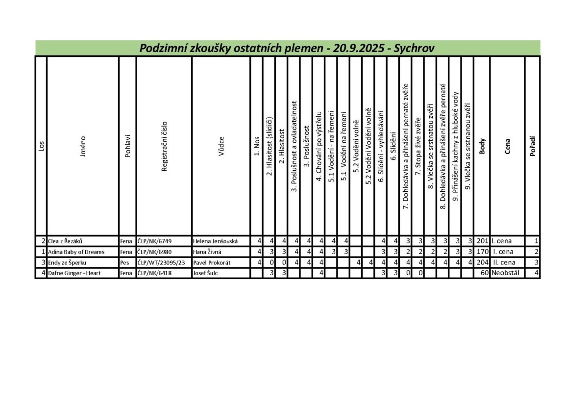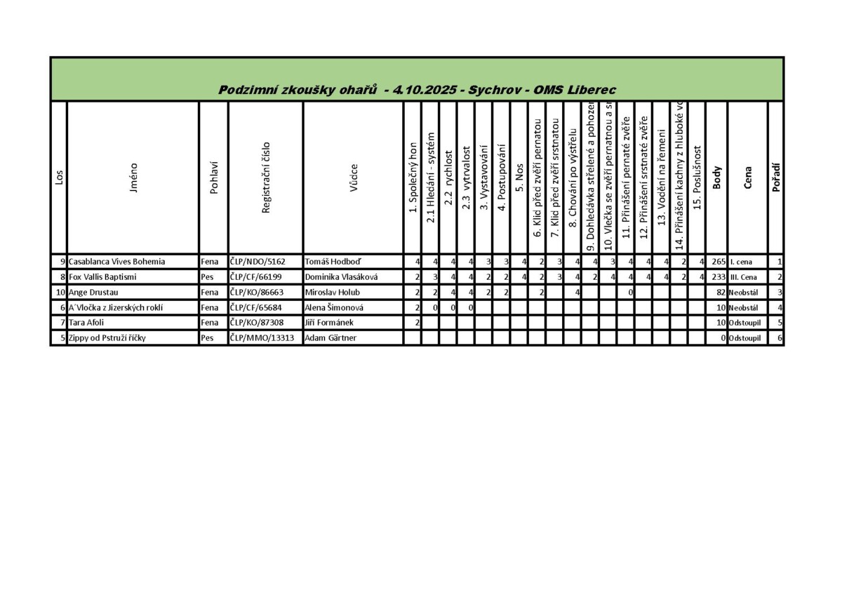 Výsledky a průběh zkoušek - Podzimní zkoušky ohařů a ostatních plemen - 4.10.2025 - Sychrov