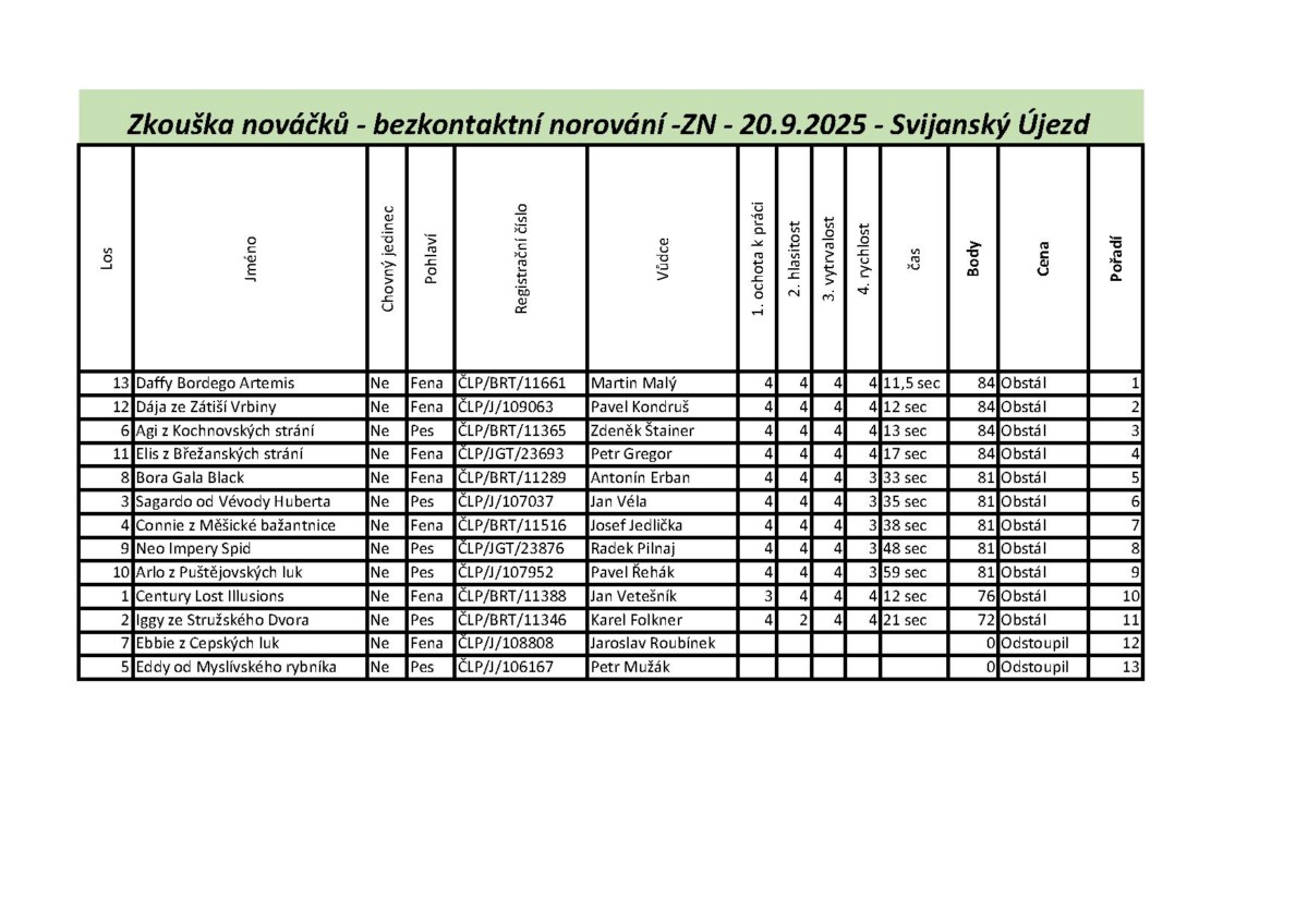 Výsledky a průběh zkoušek - Zkouška nováčků - bezkontaktní norování - 20.9.2025 - Svijanský Újezd