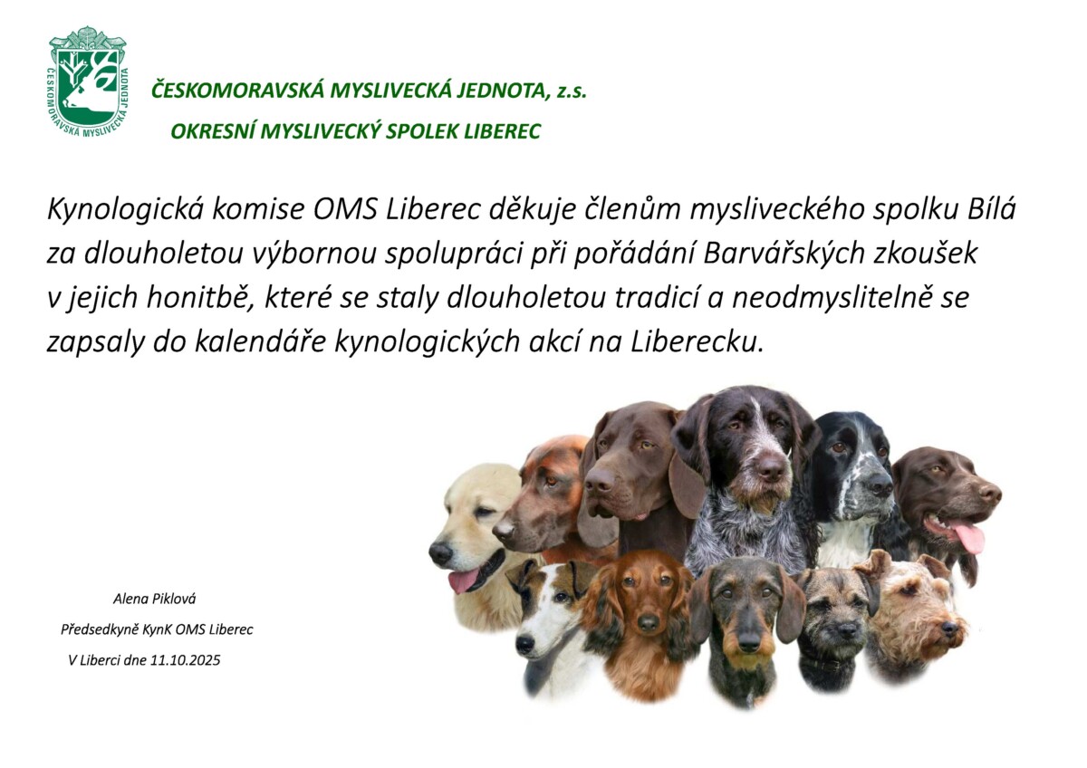 Děkuji obci Bílý Kostel nad Nisou a panu starostovi Ing. Jiřímu Formánkovi za umožnění letošního svodu lovech psů a zároveň umožnění mysliveckého dne a výstavy loveckých trofejí.