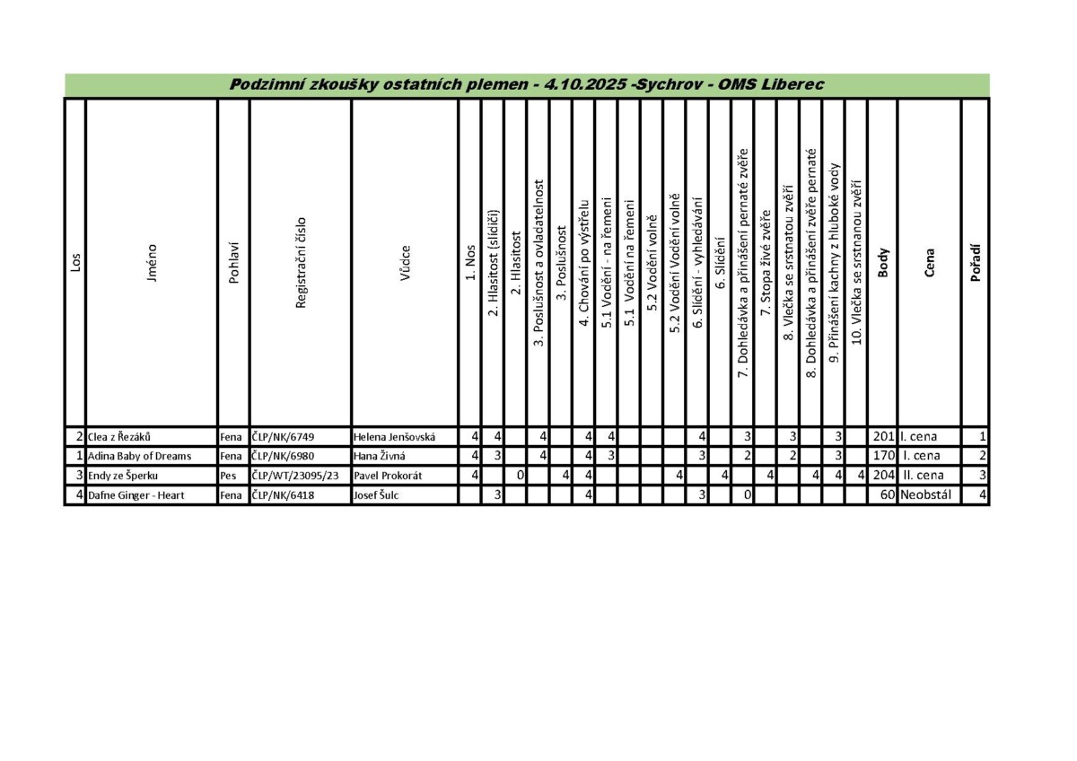 Výsledky a průběh zkoušek - Podzimní zkoušky ohařů a ostatních plemen - 4.10.2025 - Sychrov